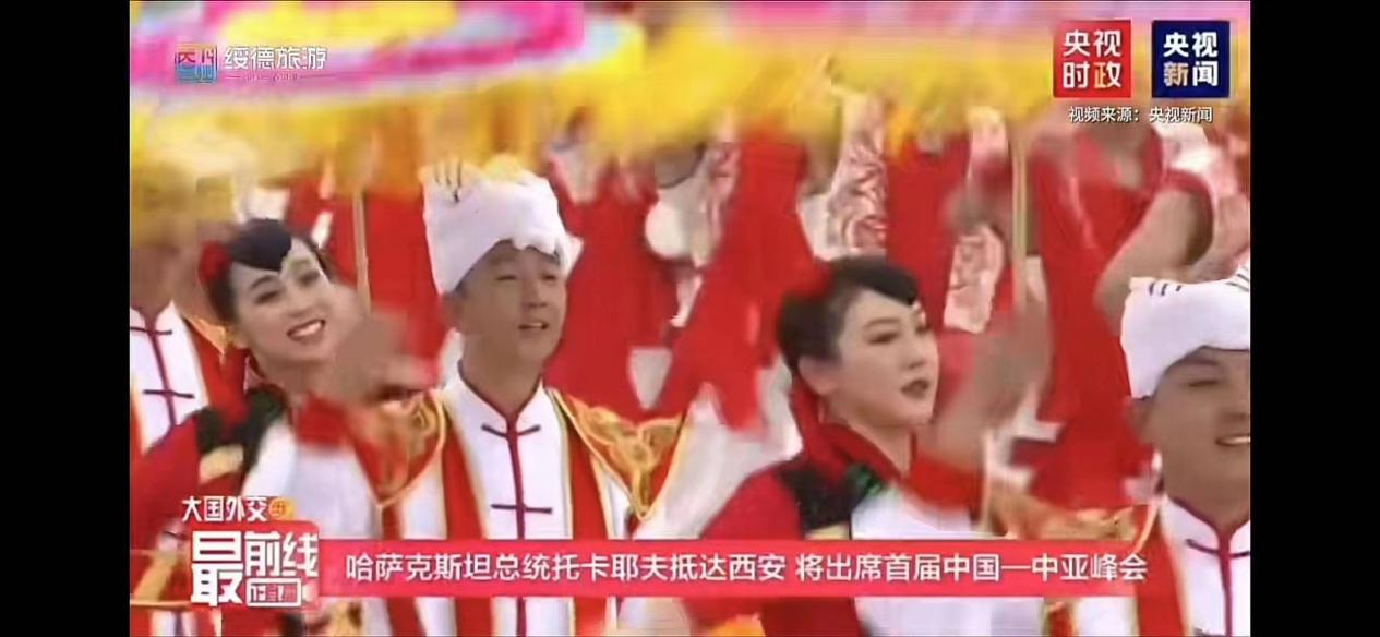 等候在西安咸阳国际机场的演职人员同其他腰鼓队一起,在《春节序曲之秧歌调》的旋律伴奏下,用彩绸和花伞舞出了黄土地上陕北儿女的热情奔放、粗犷温柔的性格特点,生动的体现了我国人民喜迎八方来客、热情洋溢、敲锣打鼓、载歌载舞的欢庆场面。