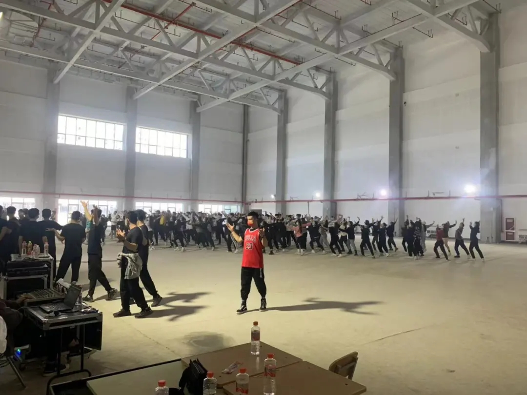 在排练初期,排练地点选定在一个新建好的体育馆内,因场馆内部装修未完成,演员们在场馆内排练,造成场地内尘土飞扬,演员们戴好口罩,在简陋的排练环境中完成排练任务。