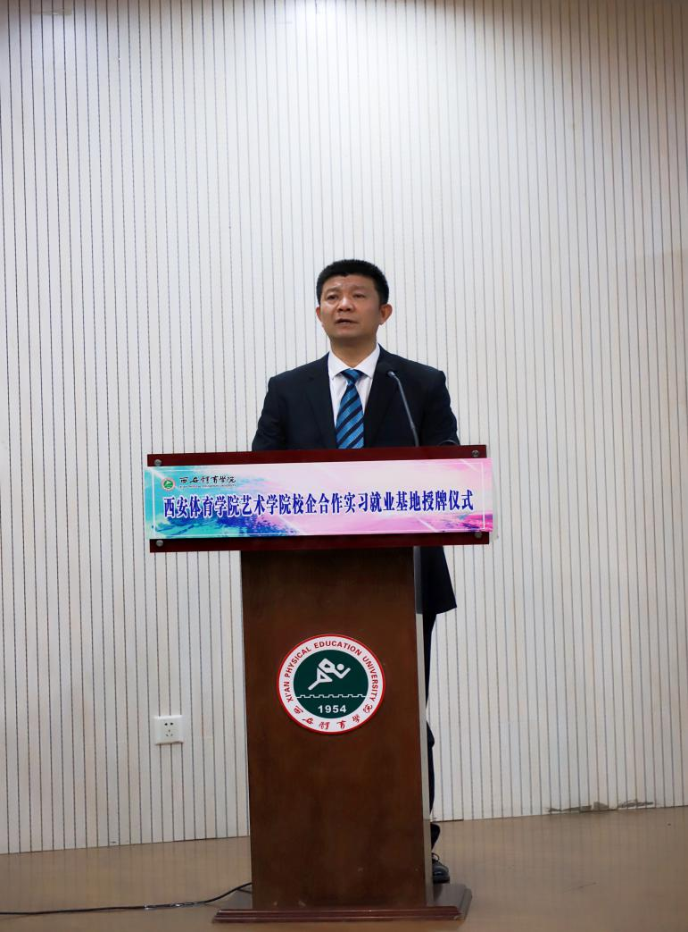 活动伊始,艺术学院院长杨占军代表艺术学院对出席本次仪式的领导、嘉宾表示感谢,他在致辞中首先对艺术学院各项历史与情况作了简要介绍,并且对实习就业基地与艺术学院合作模式提出了几点意见,他说:建立就业实习基地是学生培养与社会融合的需要,艺术学院与各用人单位要加深合作,共同开创实习就业双融合模式,不断加强毕业生理论与实践融合程度,逐步推进毕业生融入社会的能力。艺术学院高度重视与各合作单位共建实习就业基地,规范化、系统化建立实习就业基地,校企双方需不断加深双边合作,不断深化其内涵、丰富其内容、扩大其成果,共同开创校企合作新局面,为推进落实党中央“六保”“六稳”工作要求不断努力,共同开创今年会就业工作新蓝图!