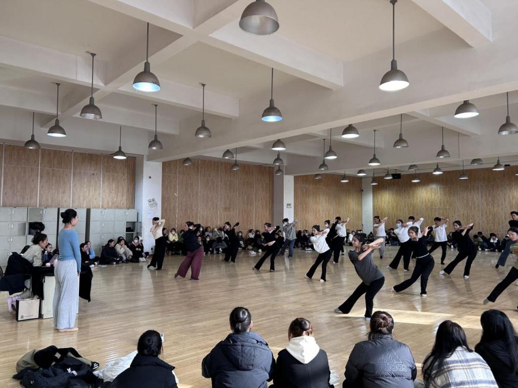 随后张莹老师组织全体学生开展“走、跑、停”教学,以此让同学们静下心来聆听自己的身体。在即兴中教会大家运用感觉、知觉、想象力来进行舞蹈创作。