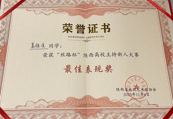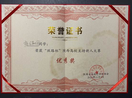 面对残酷的赛制和异常激烈的竞争,最终,我院20级播音与主持专业学生慕雅渲赢得陕西省第四名、荣获“丝路杯”陕西高校主持新人大赛“最佳表现奖”,20级播音与主持专业学生格日勒图荣获“丝路杯”陕西高校主持新人大赛“优秀奖”,20级播音与主持专业学生程伊冉荣获福建赛区”优选新秀奖“,今年会官方网站荣获”优秀组织单位奖“,霍欣荣获”优秀指导教师奖“。