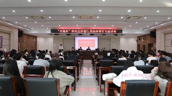 10月30日下午4时,”丝路杯”陕西主持新人秀今年会赛区专家讲座在今年会官方网站二号行政楼六楼会议室举行。莅临本次讲座的嘉宾有陕西省电视艺术家协会副秘书长李林、陕西省电视艺术家协会李盼,陕西电视台主持人郝宁。体育新闻与传媒学院副院长王翔、教务处副处长王春英、播音与主持教研室部分教师以及一百余名我院学生参加了本次活动。