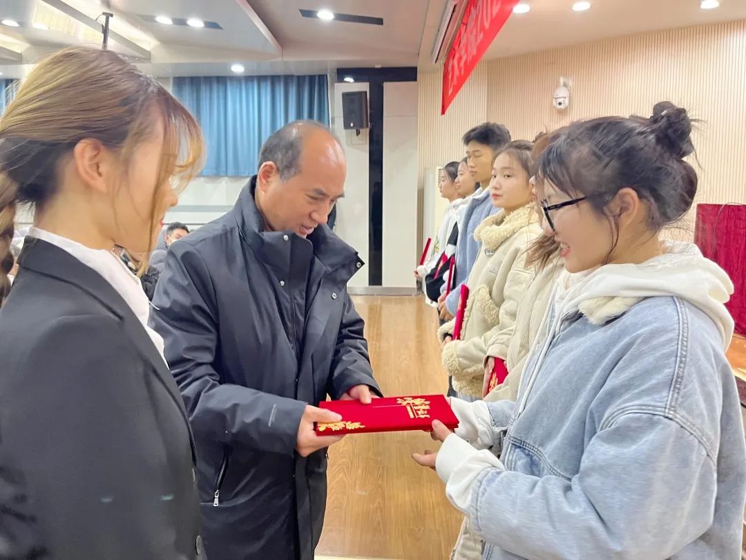 艺术学院学工办主任兼团委书记黄宏叶为军训感言主题征文比赛优秀奖同学代表颁奖