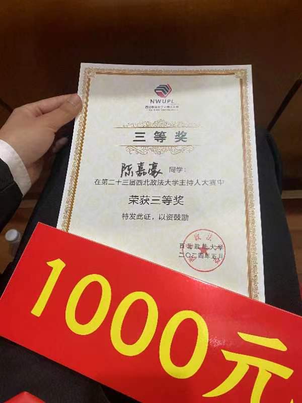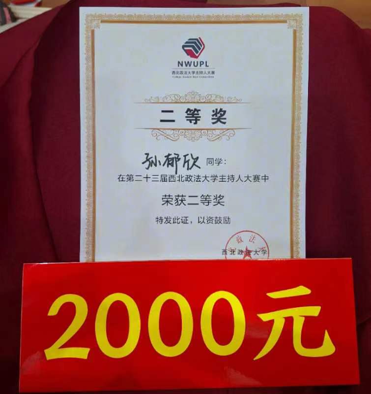 “雅颂乘风,新声启梦”,为深入学习贯彻习近平新时代中国特色社会主义思想,传承弘扬中华优秀传统文化,助力青年学子勇担新时代的文化使命,5月18日至31日,历时半个月的第二十三届西北政法大学主持人大赛圆满落幕。我院共选派共11人参赛,其中4人进入复赛,2人闯入决赛。最终,我院2023级学生孙郁欣获得二等奖、陈嘉豪获得三等奖。