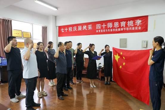 会议第二项,学院教师齐聚在庄严的国旗下,进行宣誓并重温人民教师宣言。老师们面向国旗,心中满是对祖国的热爱和对教育事业的崇敬。宣誓仪式开始,学院领导带领老师们庄严宣誓:“我志愿成为一名人民教师,忠诚党的教育事业,遵守教育法律法规,履行教书育人职责……”誓言铿锵有力,这次活动不仅增强了教师们的责任感和使命感,也为教师节增添了一份庄重与神圣。相信在新的学期里,学院的老师们将以更加饱满的热情投入到工作中,为教育事业书写更加辉煌的篇章。