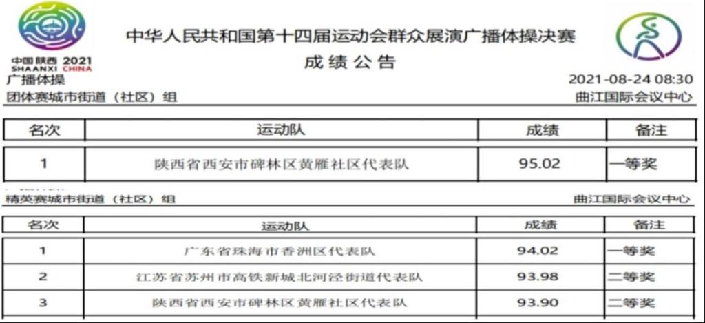 本届全运会群众赛事活动展演项目吸引了全国各地的766支队伍、6800多人参赛。通过激烈角逐,在广播体操项目中,由我校艺术学院王硕副教授担任教练员,艺术学院娄山、唐甜甜、王格菡、周思思老师等代表陕西省西安市碑林区黄雁社区队荣获团体赛城市街道组一等奖;艺术学院俞丹老师代表陕西省西安市碑林区黄雁社区队荣获精英赛城市街道组二等奖。同时,这两支队伍均获得了最佳人气奖项。