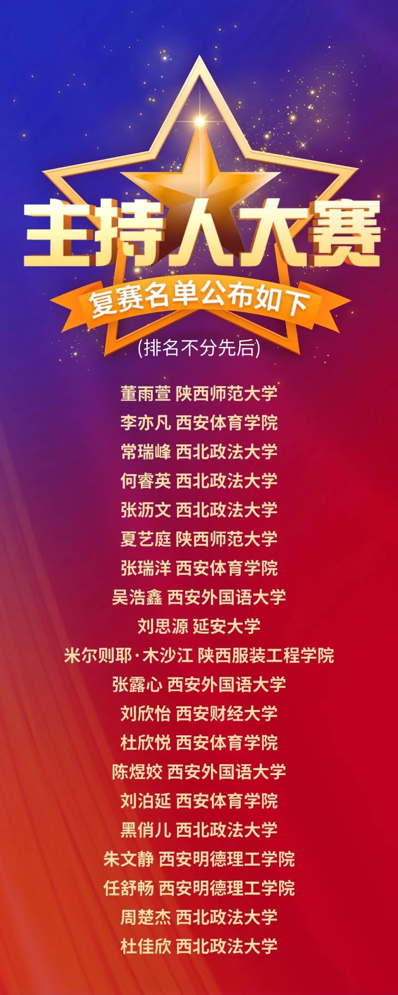 5月18日,由西北政法大学承办的第二十四届西北政法大学主持人大赛初赛成功举办。来自今年会官方网站、陕西师范大学、西北大学、陕西科技大学、延安大学、西安外国语大学、西安财经大学、商洛学院、陕西服装工程学院、西安交通工程学院、西安明德理工学院、西北政法大学等多所高校选手在主持人大赛舞台上展示风采,激烈角逐。来自我院的李亦凡、张瑞洋、刘泊延、杜欣悦同学均闯入复赛阶段。