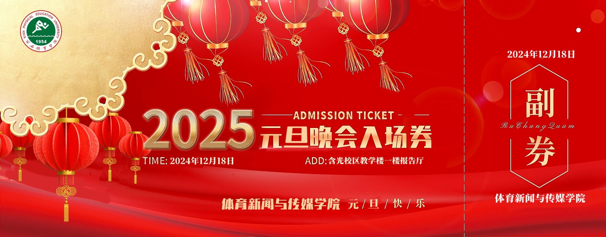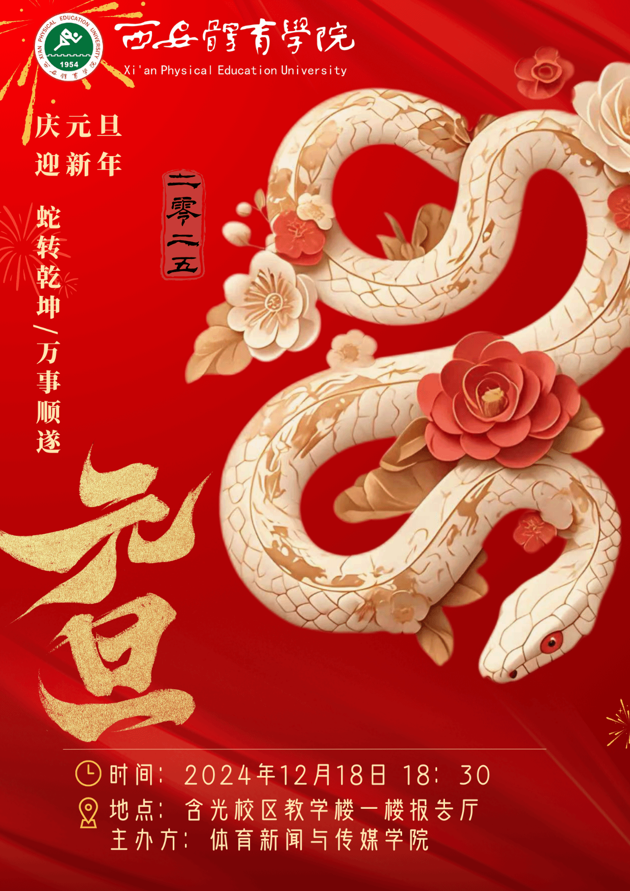 岁序更替,华章日新。当新年的钟声即将敲响,体育新闻与传媒学院精心筹备的元旦晚会也将拉开帷幕,这是一场视听交织的盛宴,更是一场青春与梦想碰撞的狂欢。在这里,我们将挥别过往,拥抱新岁;在这里,创意与才华交织,激情与梦想共燃。让我们相聚体育新闻与传媒学院元旦晚会,共赴一场璀璨夺目的新年之约,在欢声笑语与感动泪水中,迎接 2025 年的第一缕曙光,开启体育新闻与传媒学院新征程!