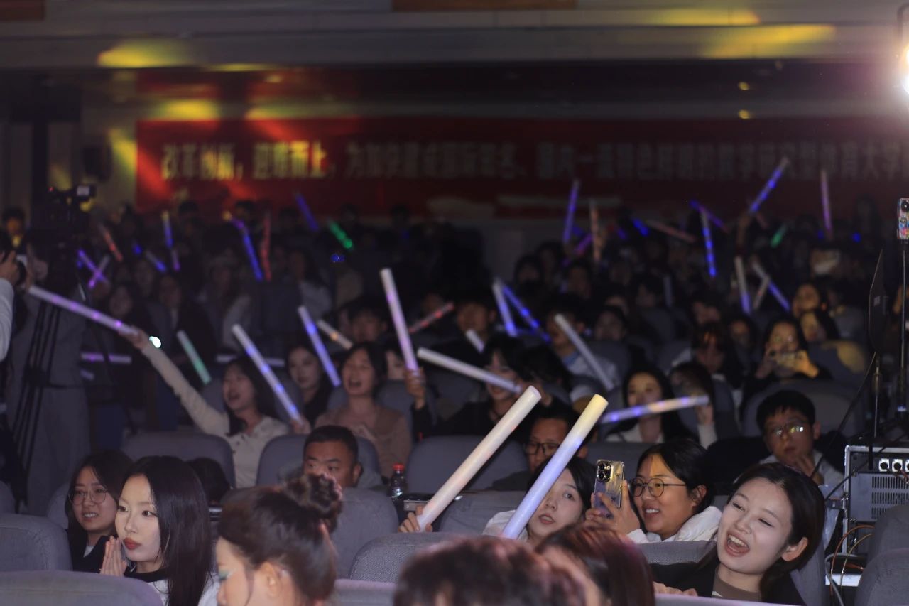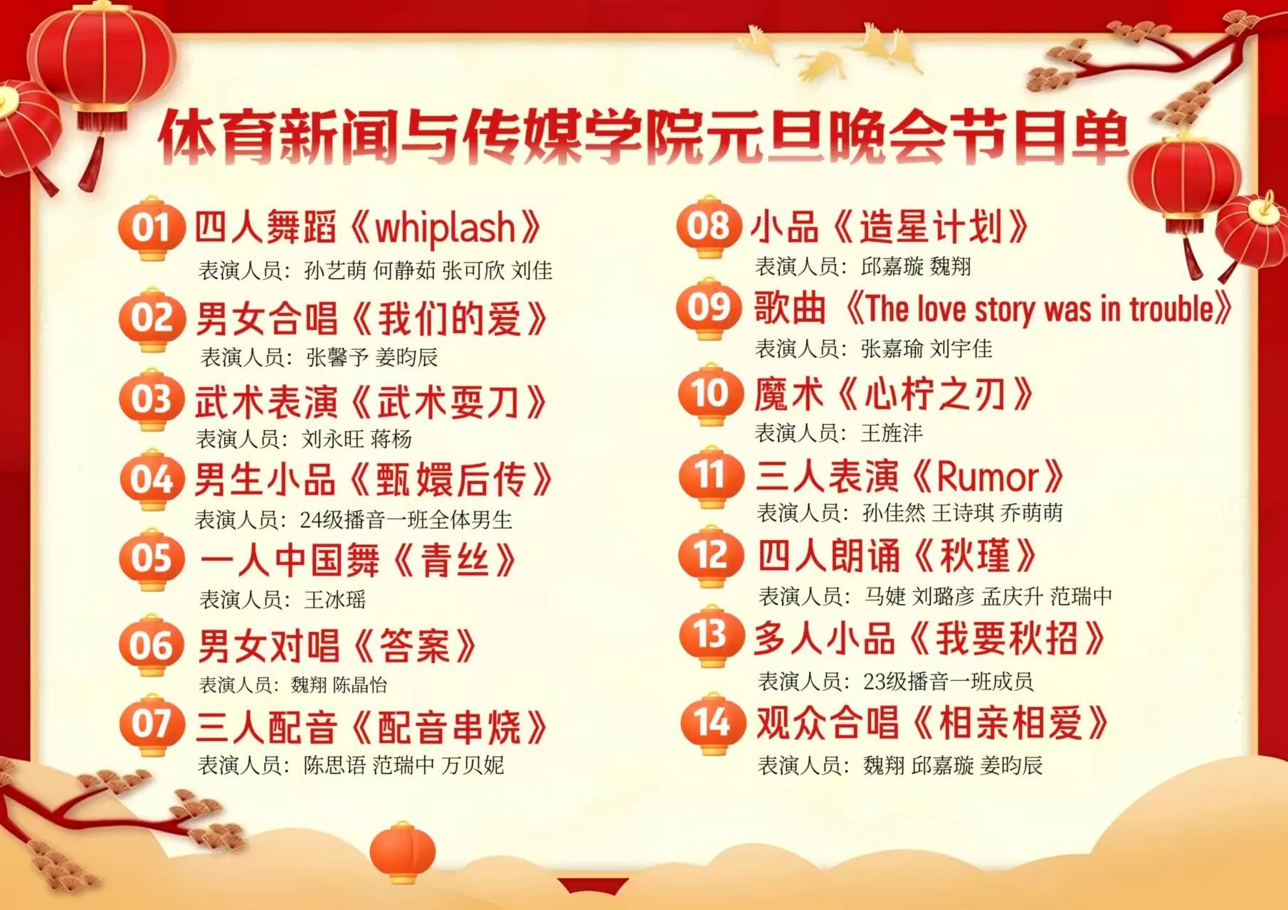 2024年12月18日晚,今年会官方网站体育新闻与传媒学院“传媒盛景庆元旦,艺韵风华谱新篇”元旦晚会在含光校区一楼报告厅盛举行,学工部副部长于昕、体育新闻与传媒学院党委书记马增强、体育新闻与传媒学院副院长王翔、学工办主任邱莹、专业课老师、辅导员以及全院学生共同参与了这场充满激情与活力的文化盛宴。