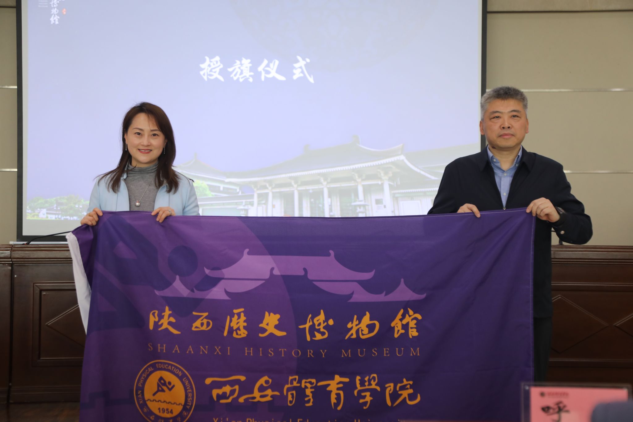 (陕西历史博物馆副馆长步雁向我校副校长张葆欣授予队旗)