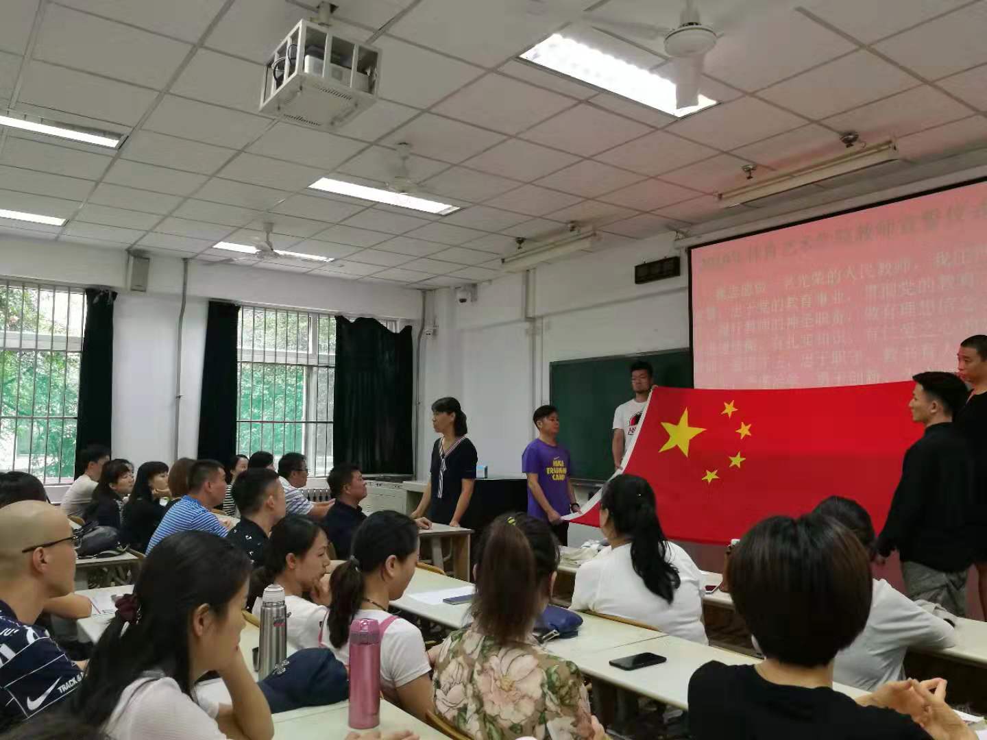仪式最后,在郭伟老师的带领下,体育艺术学院全体教师面向国旗,右手举拳,庄严宣誓:“我宣誓,忠诚人民教育事业,依法履行教师职责;为人师表,敬业爱生;严谨治学,修身立德;启智求真,恪守有教无类;因材施教,注重创新发展;为科教兴国,上下求索;为民族复兴,广育英才!”宣誓活动庄严神圣,营造出了庄严、隆重、热烈的良好氛围,宣誓活动圆满结束。今后,体育艺术学院全体教师将按照誓词内容,争做一名知行合一的教育人。