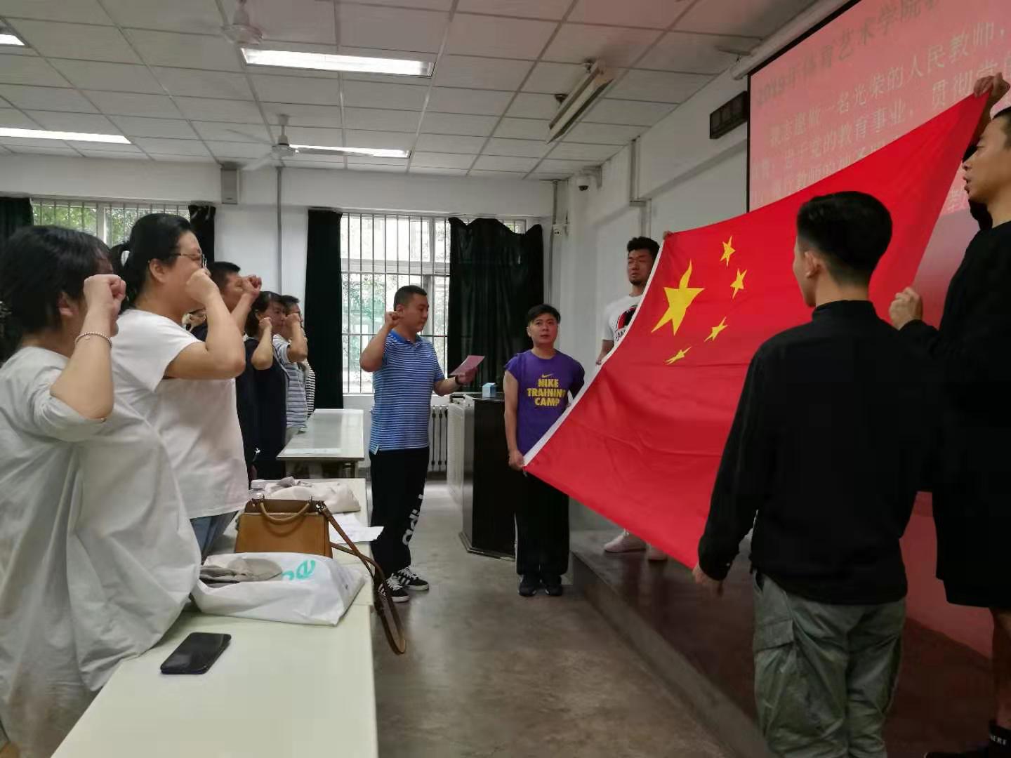 教师宣誓活动由体育艺术学院杨占军院长主持,全体教师奏唱国歌,丁雪艳书记宣讲开展教师宣誓活动的重要意义,操舞教研室牛嘉老师代表青年教师发言。活动旨在通过教师宣誓的仪式。焕发教师教书育人的神圣使命感,感受师德风范和师道尊严,明确“四有好老师”“四个引路人”“四个相统一”的职业追求,传承“学高为师、身正为范”的职业道德追求,严守师德规范和师德底线,模范践行社会主义核心价值观。