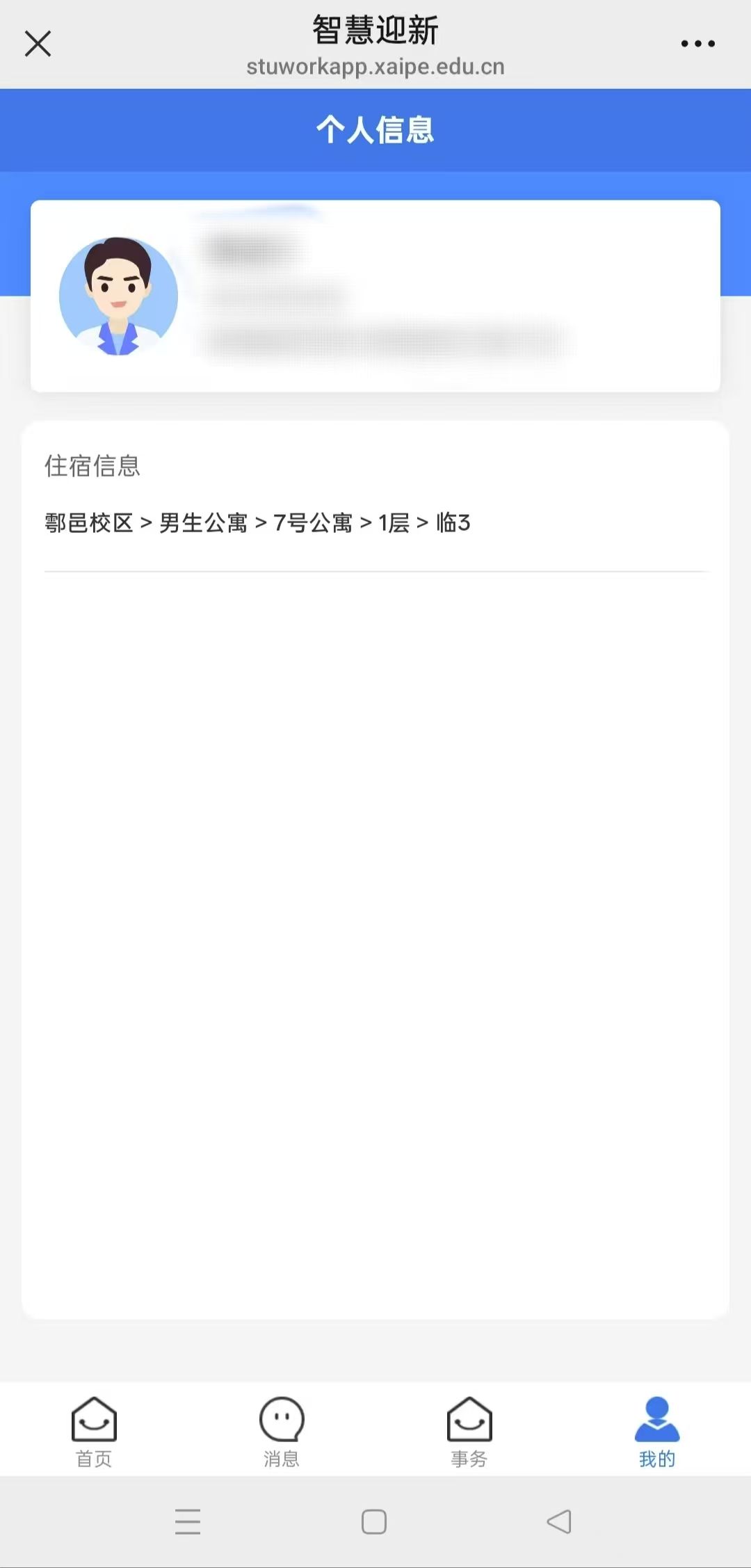 4.9 住宿信息查询:手机端迎新系统右下角“我的”,进入如下个人信息页,可查看住宿信息(待公寓科排宿完毕后公布)