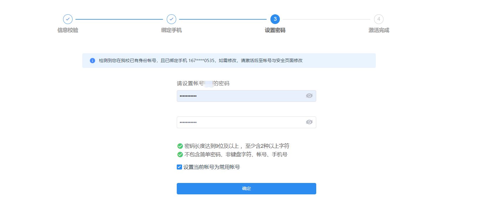 第三步:设置密码,同时系统将按照内置的密码复杂度规则对用户密码进行校验,若密码复杂度不符合规则,则不允许提交。(注:除了系统界面提示的密码规则外,包含姓名拼音、缩写等形式的密码也是不符合要求的。)
