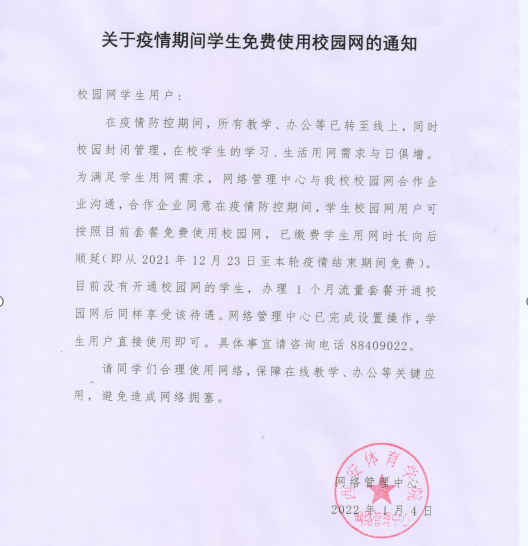 结束走访之后,网络管理中心一刻未停,立即与合作企业就师生关心的用网热点问题进行了沟通,考虑到特殊时期网络服务的迫切需要,合作企业和网络管理中心一起为同学们送上了一份暖心的礼物。