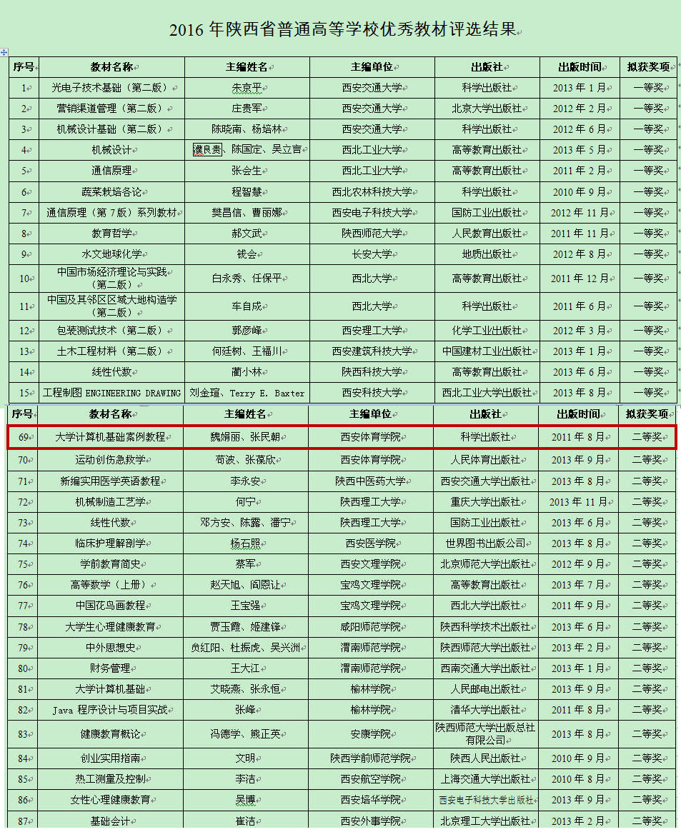 根据陕西省教育厅《关于开展2016年陕西省普通高等学校优秀教材评选工作的通知》(陕教高办〔2016〕11号),省教育厅组织开展了2016年陕西省普通高等学校优秀教材申报工作。全省76所高校共推荐了236种教材参与评选。经省教育厅专家评审,2016年陕西省普通高等学校优秀教材评奖共评出本科教材一等奖34项、二等奖80项。我中心魏娟丽教授、张民朝教授主编的《大学计算机基础案例教程》获得二等奖。