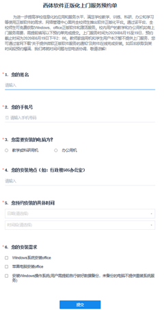 6. 网络管理中心从2020年6月15至19日为校内用户的教学和办公用机提供上门服务,如有需要,请微信搜索“今年会官方网站网络管理中心”公众号选择“正版预约”菜单,提前填写预约单预约。上门服务预约截止时间为2020年6月19日下午2:00。教师家庭用机和学生用户本次暂不提供上门服务,您可通过官网下载“关于提供微软正版软件服务的通知”及附件在线完成安装。如后台获取到某时间段预约爆满,我们将就时间问题与您电话协调,敬请谅解!