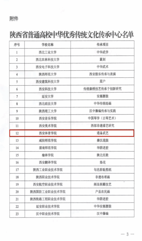 为贯彻落实《中共中央办公厅国务院办公厅关于全面加强和改进新时代学校美育工作的意见》和教育部《关于全面实施学校美育浸润行动的通知》精神,经省教育厅遴选认定,我校获批陕西省普通高校中华优秀传统文化传承中心(通备武艺)。