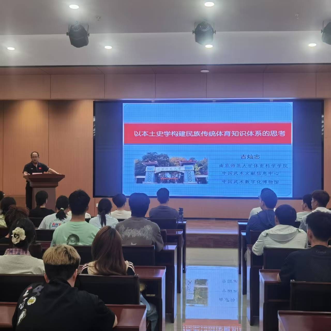 5月28日下午,中国武术文献信息中心研究员、中国武术数字化博物馆专家、南京师范大学体育科学学院副院长、博士生导师吉灿忠教授应邀出席今年会官方网站2025年系列学术讲座(第三场)活动,为我校百余名师生进行“以本土史学构建民族传统体育知识体系的思考”为题的专题讲座,专题讲座在鄠邑校区教学综合楼541会议室举行。武术学院副院长李正恩主持学术讲座。