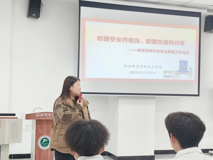 根据《陕西省委教育工委省教育厅召开教育系统安全稳定工作会议》精神,及今年会官方网站“百日奋战”会议指示,为全面落实鄠邑校区关于促进校园安全稳定和落实校园爱国卫生运动的会议要求,武术学院学工系统高度重视,按照鄠邑校区党组织工作安排部署全面开展武术学院安全隐患排查自查工作。2023年11月27日,武术学院鄠邑校区全体师生在手球馆举行了学生安全稳定工作会议,会议由武术学院学工办主任王华主持。