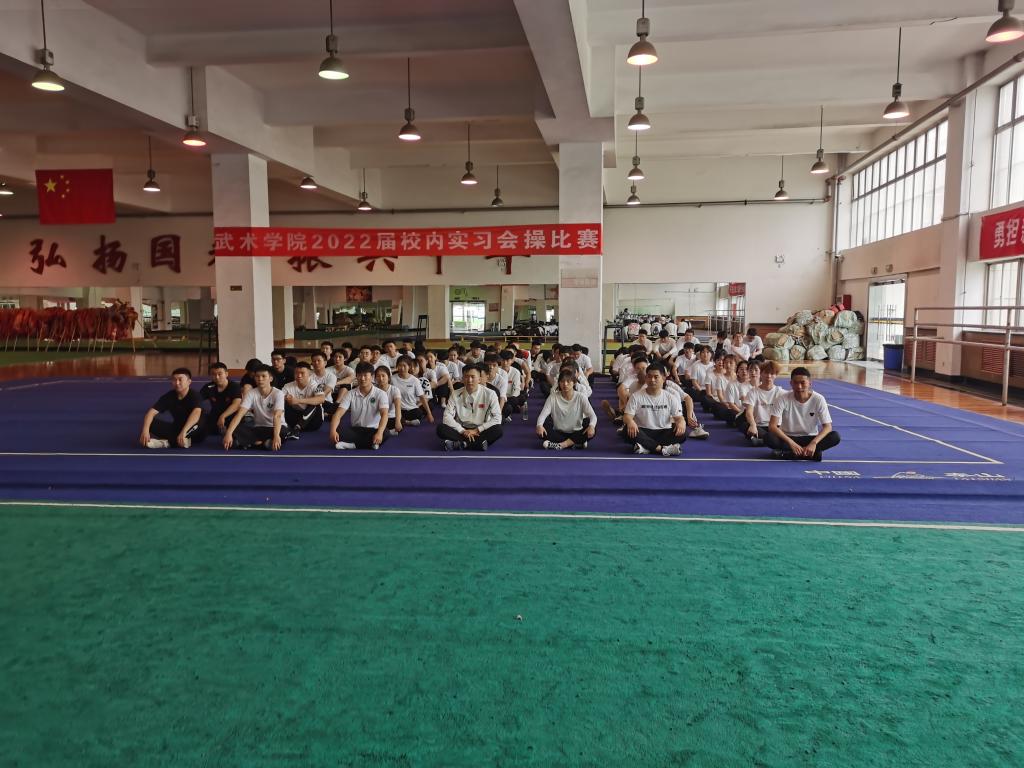 2021年6月24日下午12点30分,武术学院2022届学生校内实习会操比赛在武术套路馆举行。武术学院副院长袁金宝、总支书记朱舰、校内实习指导教师冯俊彦、套路教研室书记冯锦华、散打教研室书记蔡月飞、学工办主任王华等老师出席并观看了此次比赛。会操比赛由武术学院教学办公室主任康丝主持。