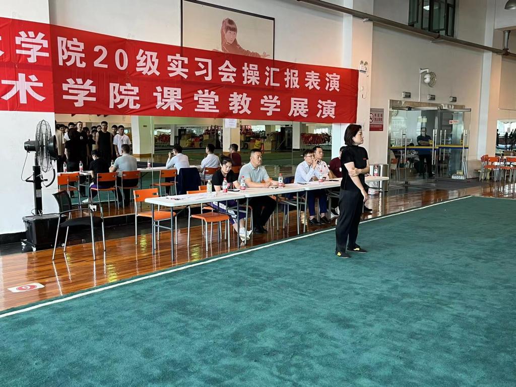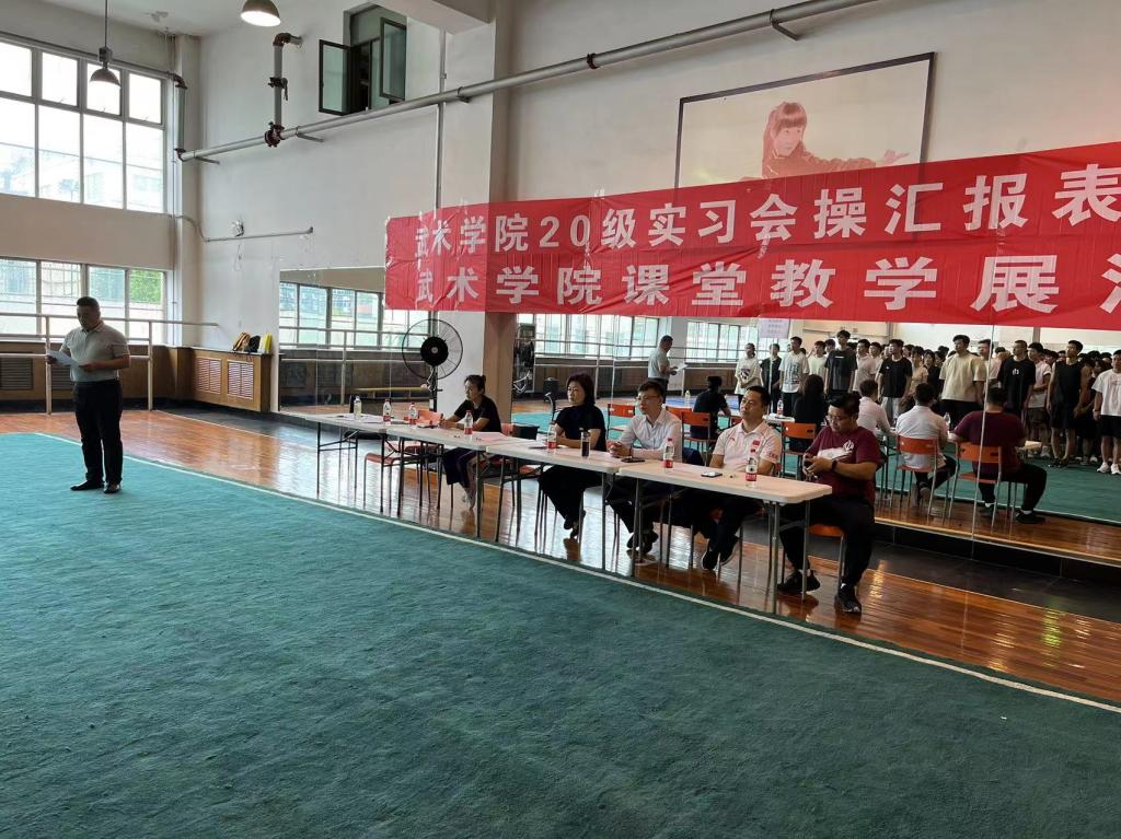 为进一步巩固教学成果,检验教学质量,同时,为学生在校外实习授课提供多样性,推动阳光校园体育活动的深入开展,6月28日下午2点,武术学院在套路馆举行了2020级课堂教学展演活动。学院领导班子、办公室人员、年级辅导员、教研室主任、书记及2020级全体同学参加了本次活动,本次活动由教学办副主任康丝主持。