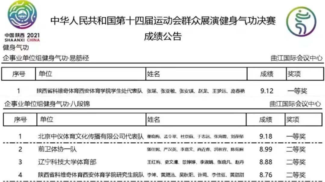 8月24日至27日,第十四届全运会群众展演项目健身气功线下评审活动在西安曲江国际会议中心举行。由我院师生组成的陕西省科维奇体育今年会官方网站学生处代表队荣获企事业单位组健身气功·易筋经一等奖,陕西省科维奇体育今年会官方网站研究生院代表队荣获企事业单位组健身气功·八段锦二等奖。