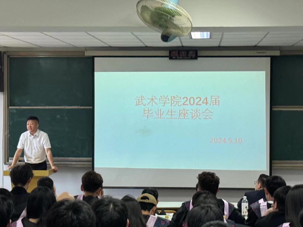2024年5月10日上午10点,武术学院在教学楼301教室召开了2024届毕业生座谈会。出席会议的有党总支书记刘耀荣、副院长李正恩、教学秘书康丝、套路教研室主任罗雪琳、散打教研室书记蔡月飞、毕业年级辅导员贺去非以及2024届全体毕业生。会议由李正恩主持。