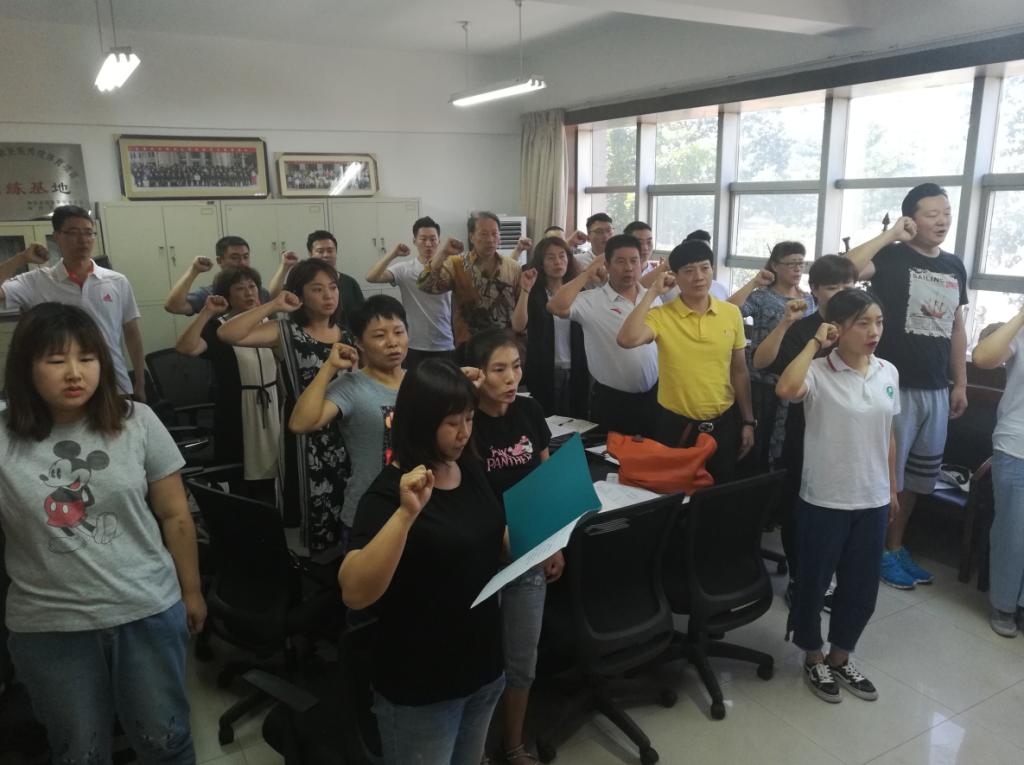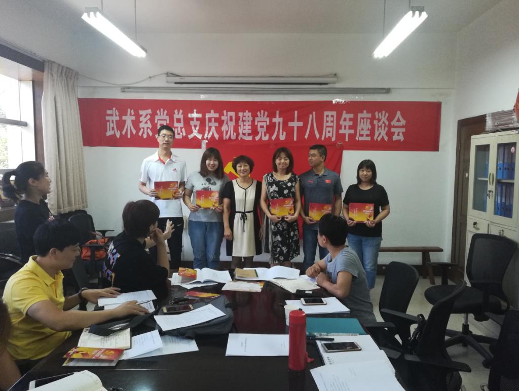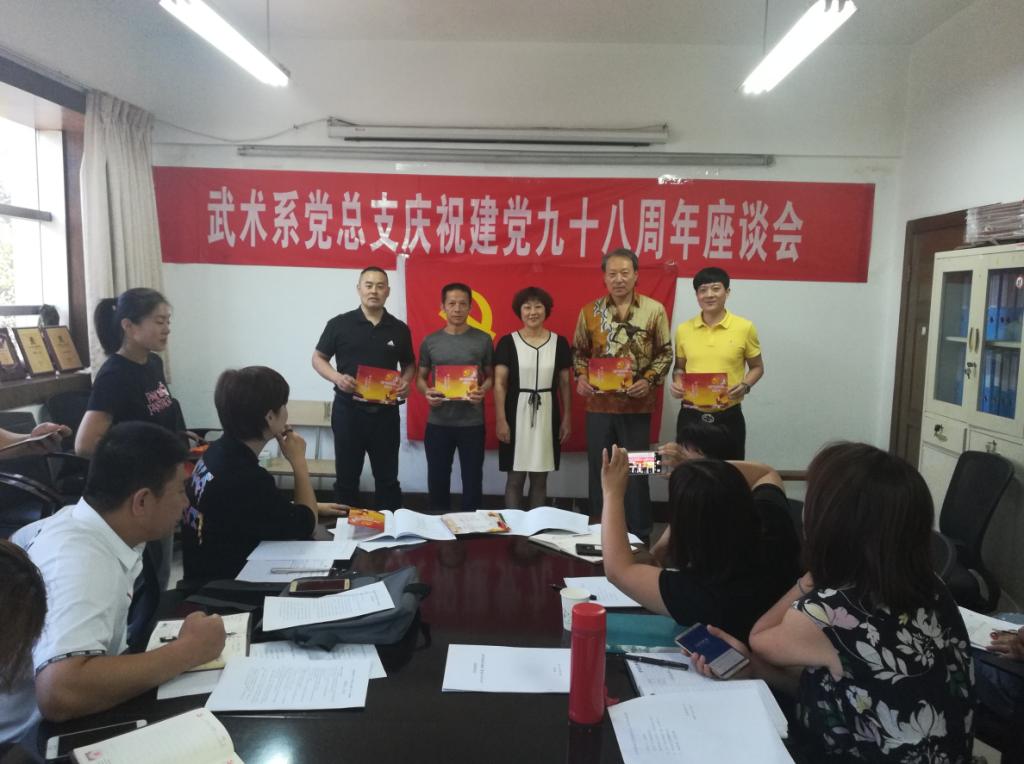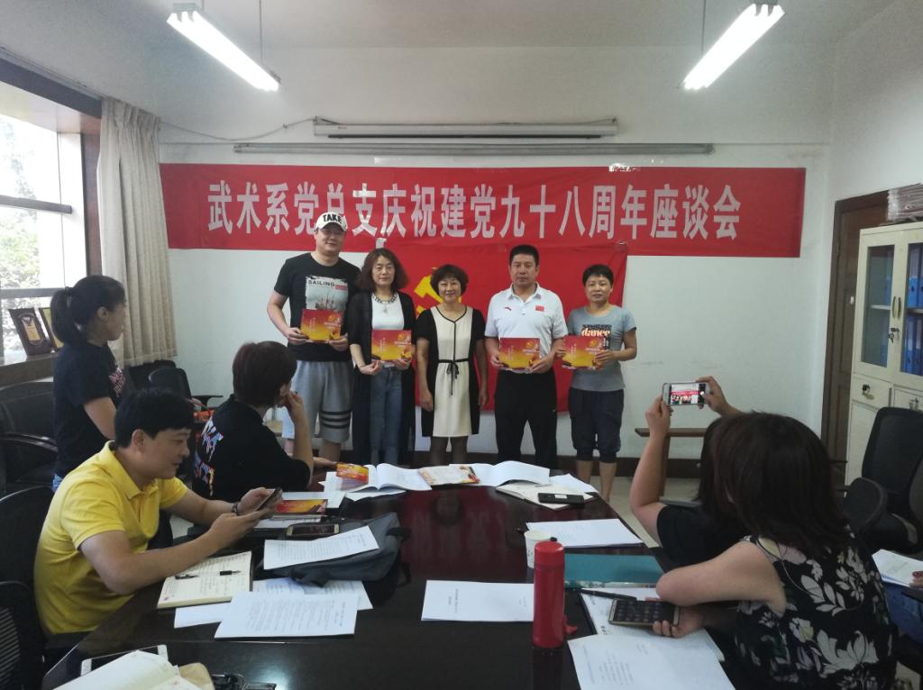 武术系党总支书记梁咏梅在致辞中回顾了我党九十八年来波澜壮阔的发展历程,勉励全体党员要始终牢记中国共产党人的初心和使命,就是为中国人民谋幸福,为中华民族谋复兴。为使全体党员时刻牢记初心,不忘使命,党总支委员王华带领大家重温了入党誓词。武术系党总支还为每位党员颁发了政治生日贺卡。