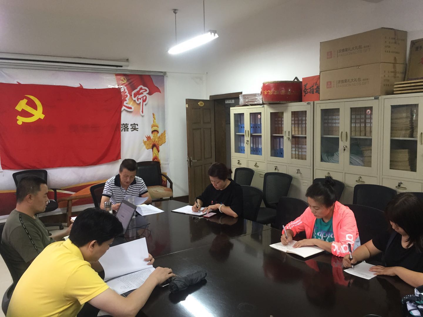 7月16日下午,武术学院党总支在‘党员学习园地’召开“以案促改”工作会议。王怡、袁金宝、朱昱、王华、蔡月飞、冯锦华参加本次会议,会议由党总支书记朱舰主持。