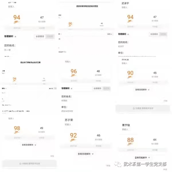 武术学院学生党支部党员参与率达到100%,通过这次党史知识答题让所有党员重温了党的历史,对党的诞生,发展历程,中国共产党初心、使命有了更深入的了解。再一次感受到中国共产党的伟大事业和坚定信念,砥砺前行,昂扬奋进新征程。