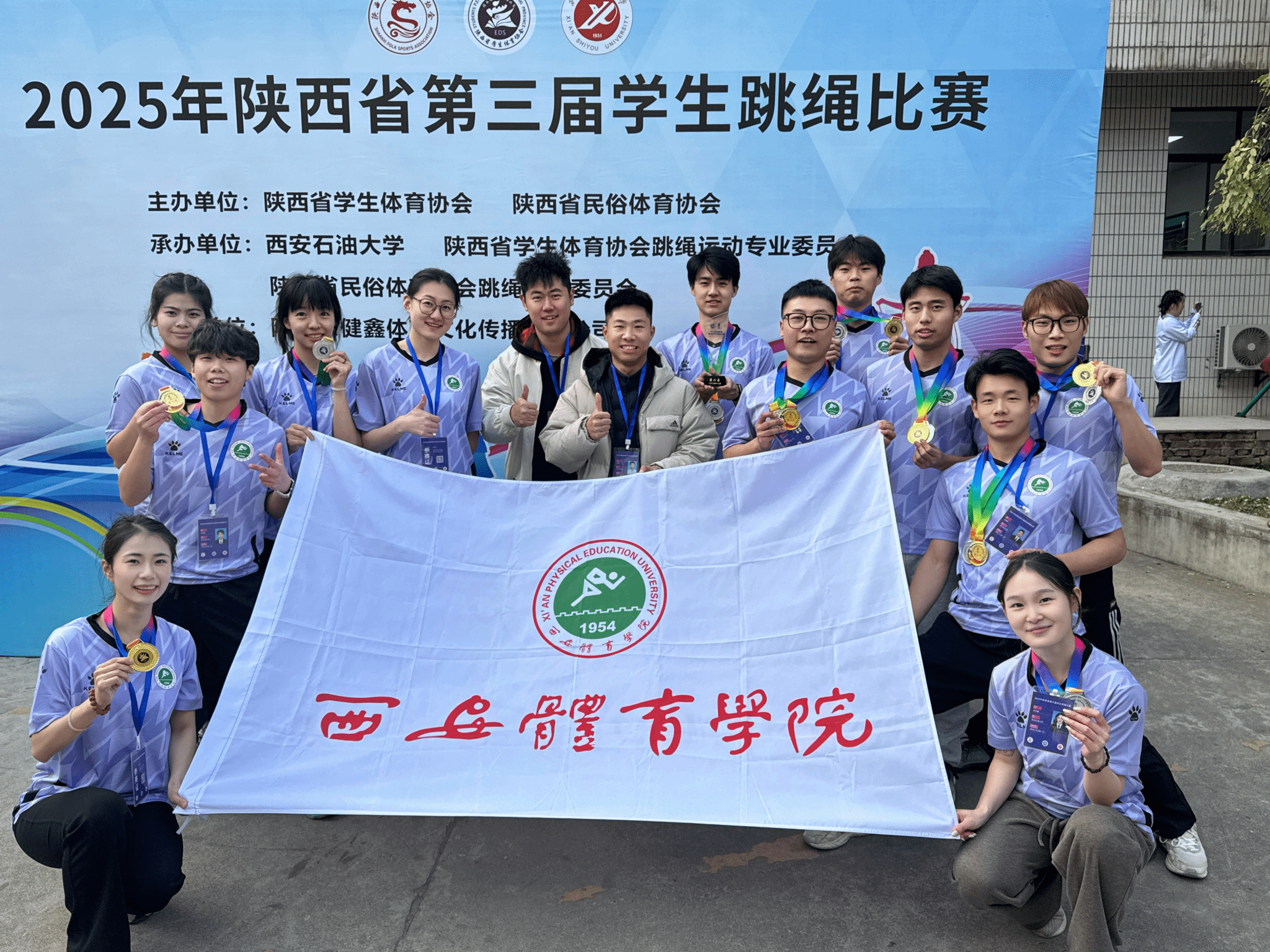 赛事由陕西省学生体育协会主办,设有幼儿组、小学组(甲、乙)、初中组、高中组、大学组(甲、乙、丙)等多个组别,涵盖个人竞速赛、双人计数赛、三人计数赛、集体竞速赛、花样规定赛及团体赛等多项竞赛内容,全面考验选手的速度、耐力、协调性与团队协作能力。我校跳绳代表队在赛场上默契配合、奋勇拼搏,凭借扎实的功底和稳定的发挥脱颖而出,最终斩获 6 枚金牌、3 枚银牌的亮眼战绩:男子 4×30s 单摇接力、女子 4×30s 单摇接力、男子三分钟单摇、男子 30s 单摇、男子 2×30s 双摇接力、男子 30s 双摇六个项目成功摘金;3 分钟 10 人八字跳绳(团体)、女子 30s 单摇、男子 30s 挽花三个项目斩获银牌。