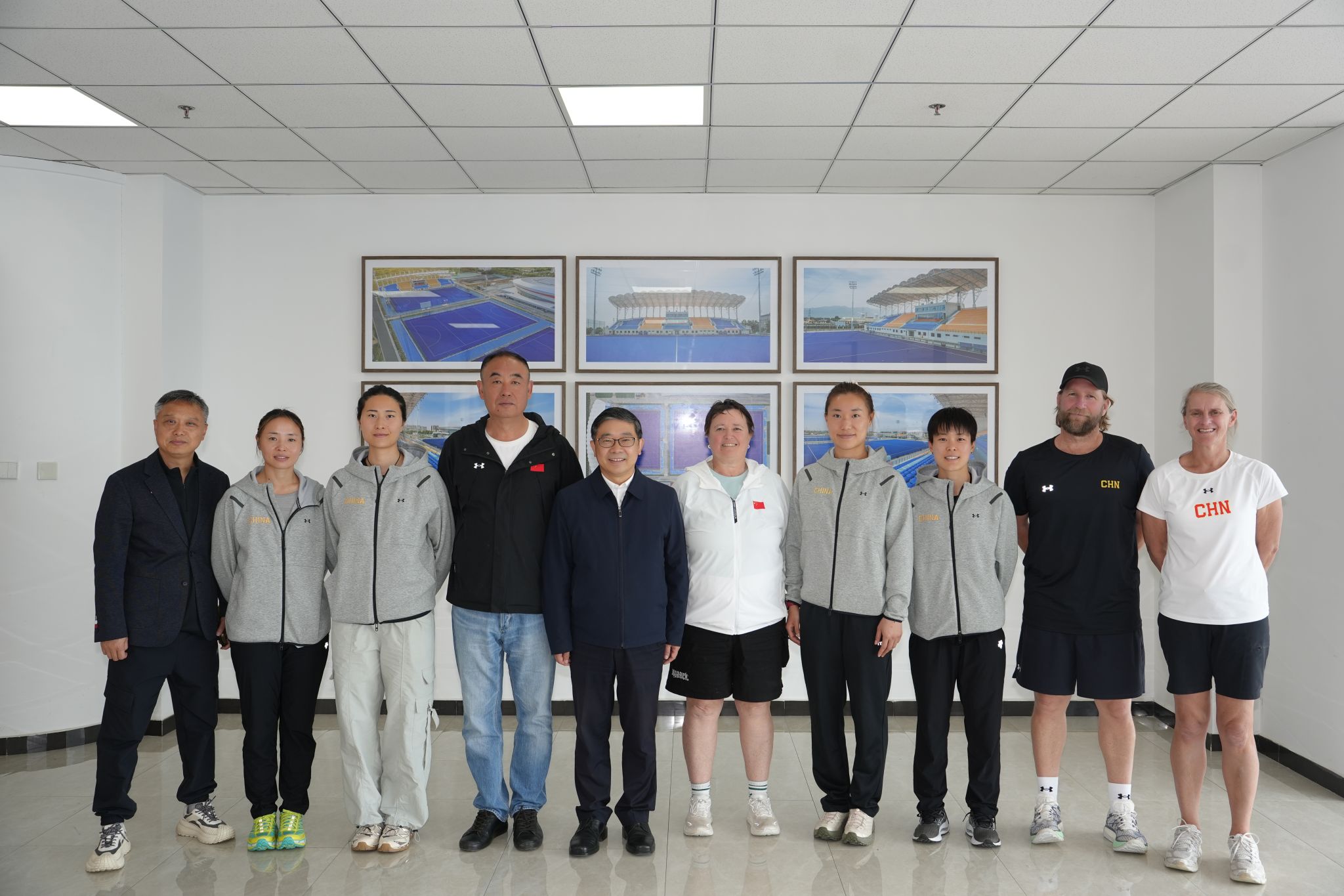 活动开始前,校党委书记刘子实到曲棍球赛场会见此次来我校集训的中国国家女子曲棍球队(以下简称“中国女曲”),与中国女曲外籍教练团队,领队、我校89级校友郭红,巴黎奥运会主力选手马宁、何江欣、陈怡、彭杨进行了交流。刘子实表示,学校自2024年获批国家曲棍球后备人才培养基地以来,大力支持曲棍球项目发展和人才培养。此次国家队前来集训,是对学校场地资源条件和综合保障能力的信任和肯定,也为学校党建引领高质量竞赛训练发展提供了借鉴和思路,希望未来能在复合型团队保障、科研攻关等更多领域与国家队开展更加深入的合作与交流。