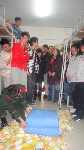 武警消防战士分别到各年级进行培训,为学生示范、讲解叠被子的各项要领。学生们认真学习,积极实践,从床铺的整理到洗漱用品的摆放,都以军人的标准严格要求自己,营造了文明、优美的学习、生活环境。