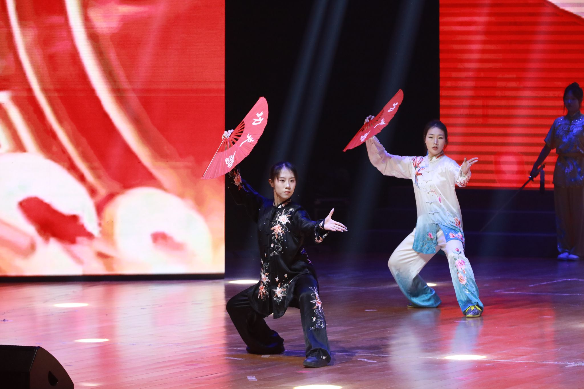 第二篇章以“梦想”为纽带,融合了传统文化与体育风采。武术学院带来的《武动乾坤》率先登场,学子们将舞旗与武术拳术相结合,动作刚劲有力,剑术行云流水,旗剑扇鞭轮番上场,一翻一越、一招一式中尽显中华武术的精气神。