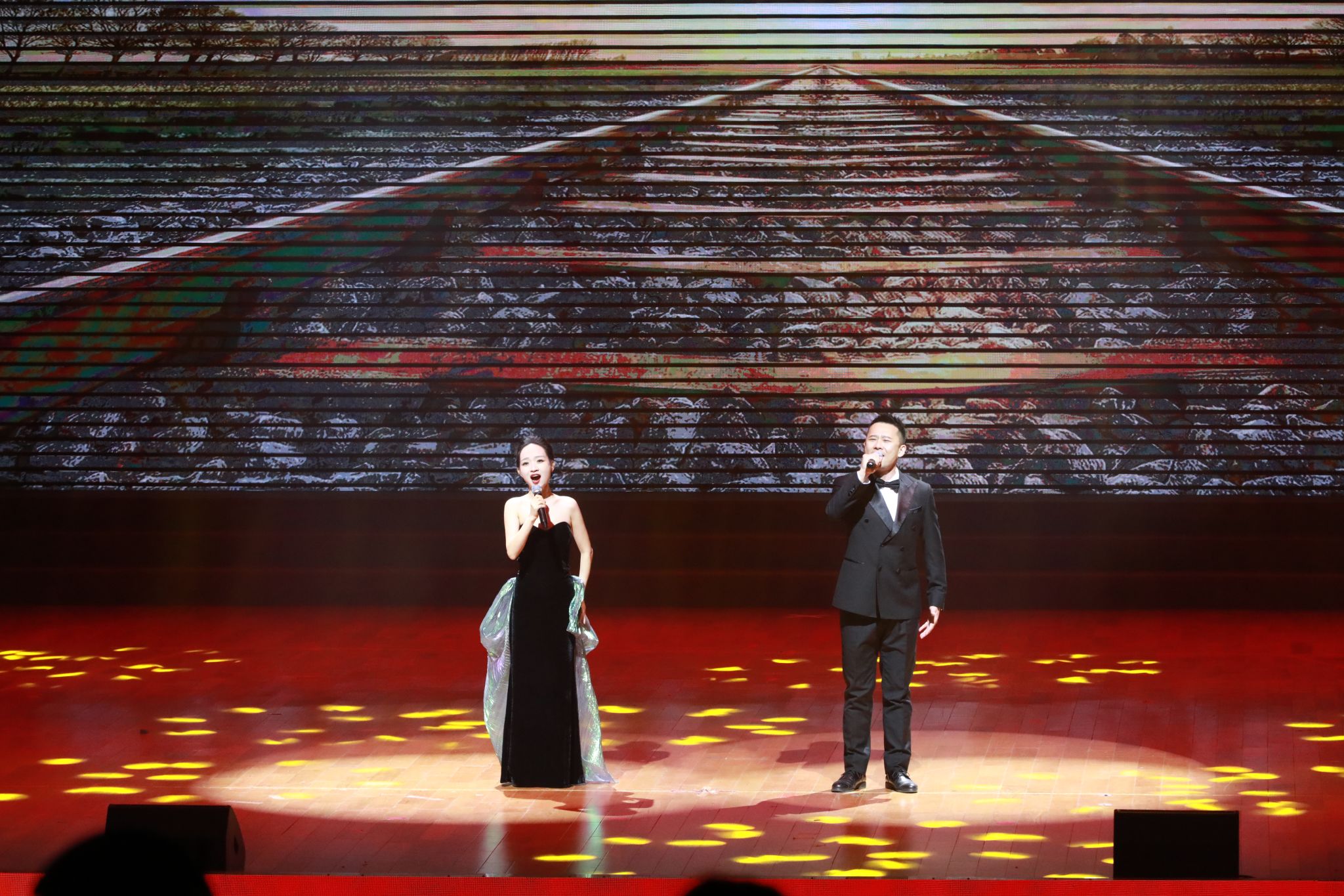 教师代表娄山、刘默寒演唱的《领航》将本篇章推向高潮。“伟大的中国共产党,乘风破浪,扬帆远航”的激昂歌声中,舞台背景里中国现代化建设成果、红色景点、壮丽河山一幕幕浮现,不仅唱出了对党的深情赞颂,更唱出了新时代新梦想。