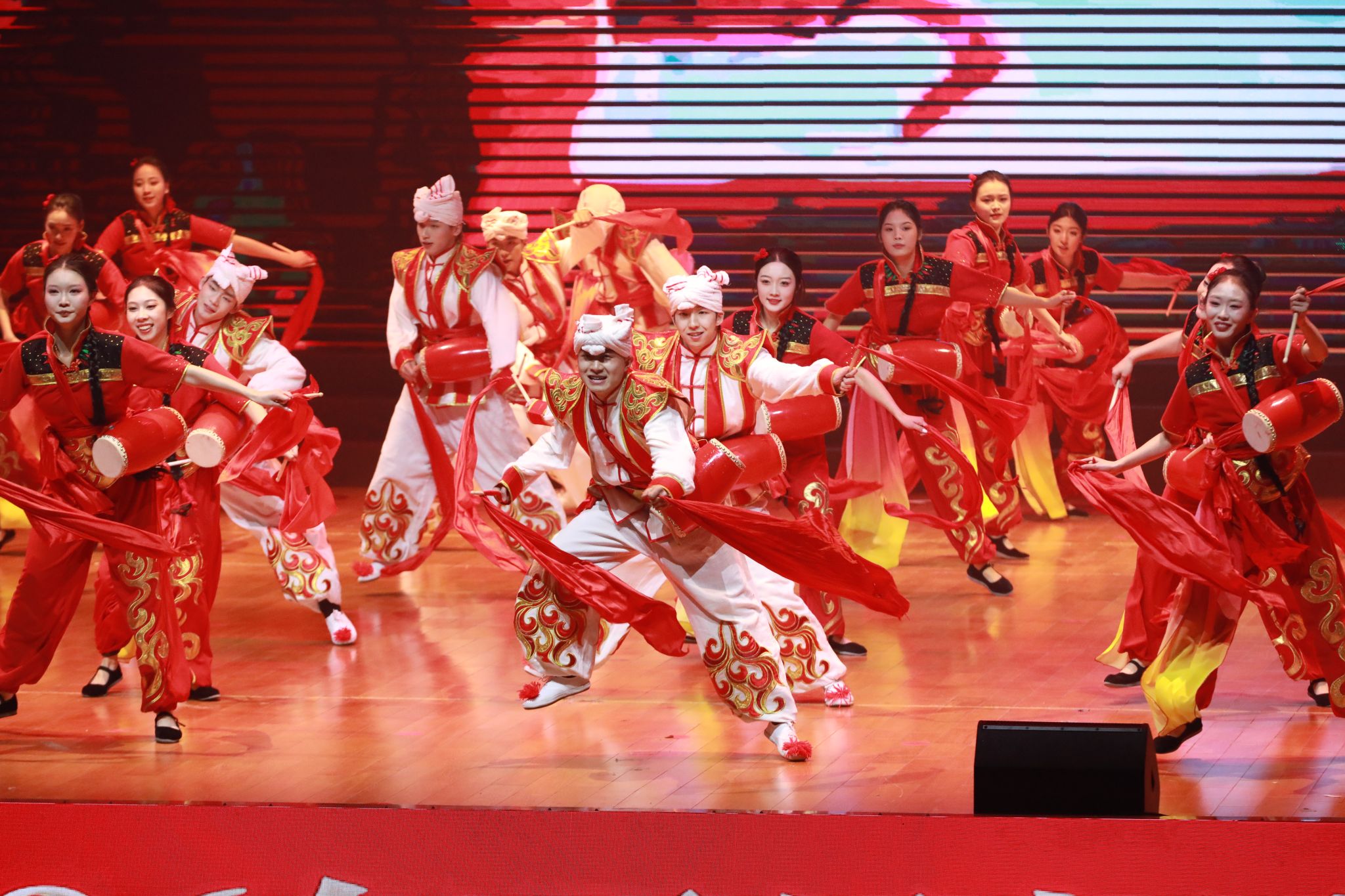 紧随其后的腰鼓表演《盛世鼓舞》气势如虹。唢呐声吹出的《东方红》响彻礼堂。舞台上盘旋的中国龙、非遗舞狮让人眼前一亮,打腰鼓的同学延伸到观众席,诠释了“盛世中国”的豪迈气象,展现了中华传统文化的创新活力。