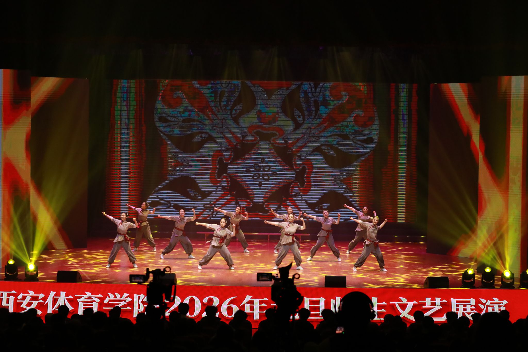 本网讯 华灯初上,辞旧迎新。12月30日晚,我校举行2026年元旦师生文艺展演。展演以“体育荣光·青春飞扬”为主题,分为赞歌献给党、共筑中国梦、奋进新征程三大篇章,通过合唱、腰鼓、武术、舞蹈等10个精彩节目,汇聚老中青三代师生,奏响爱党爱国、砥砺奋进的时代强音。