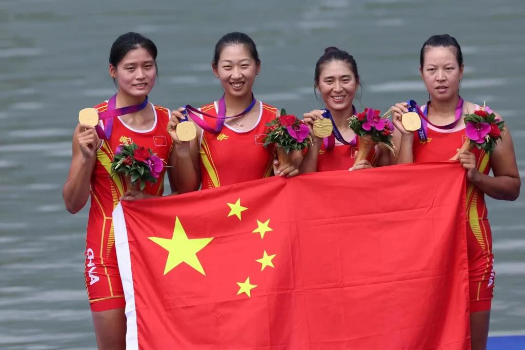 徐星叶与队友获得杭州亚运会女子四人单桨无舵手冠军、女子八人单桨有舵手冠军