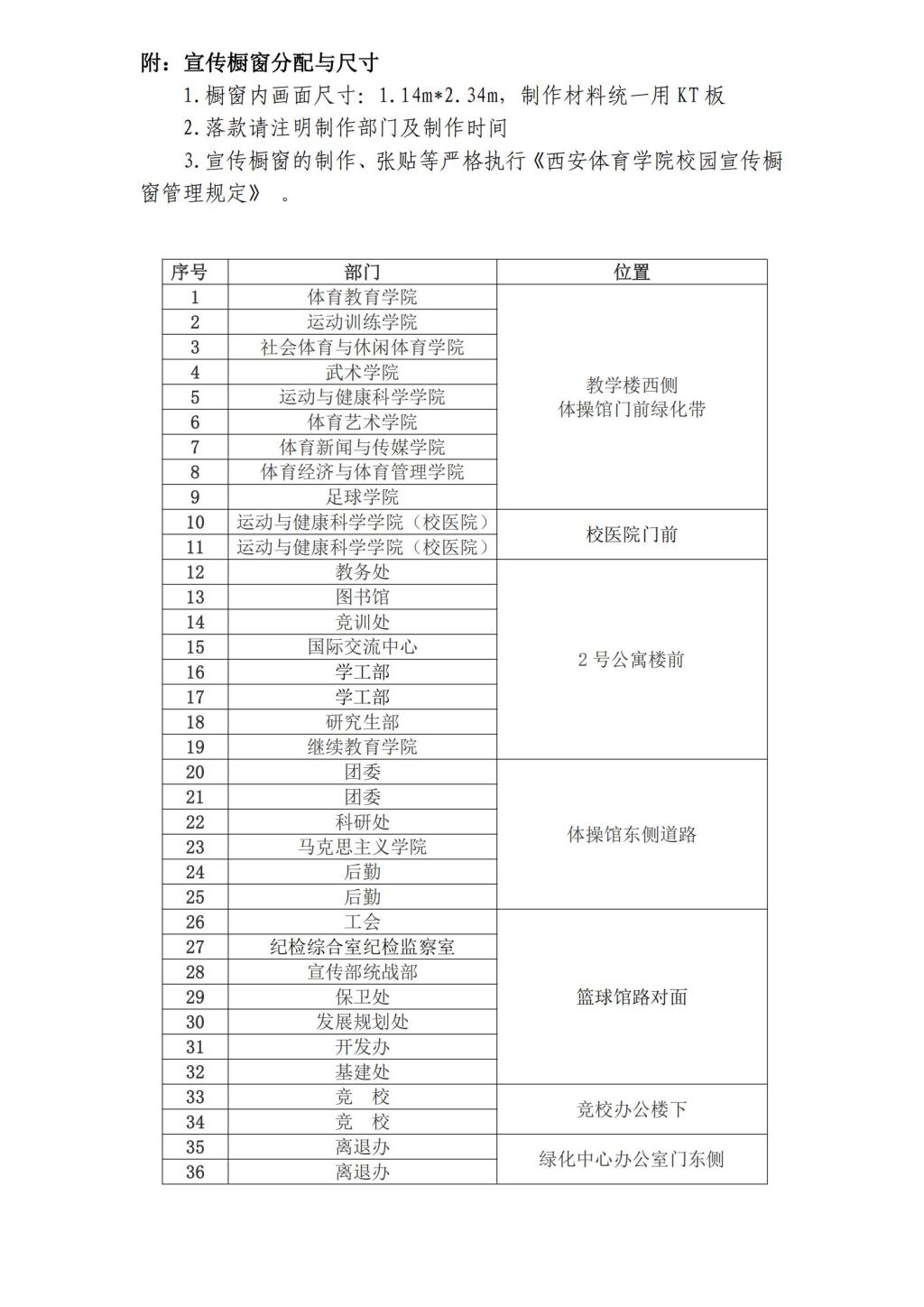 为使我校2023年各项工作起好步、开好头,号召广大师生紧紧围绕党的二十大,踔厉奋发、勇毅前行,在共同谱写今年会高质量发展新篇章上展现更大担当作为,营造良好舆论氛围,发挥校内宣传橱窗教育、引导作用,请各有关部门以实际行动践行党的二十大精神同时结合具体工作为内容,按照已分配宣传橱窗区域,进行橱窗内容更新,请于2月17日(周五)前完成更新工作。橱窗内容力求做到主题突出、特色鲜明、格调高雅、设计新颖、图文并茂,生动形象地反映相关内容。(宣传橱窗分配与尺寸见附件)