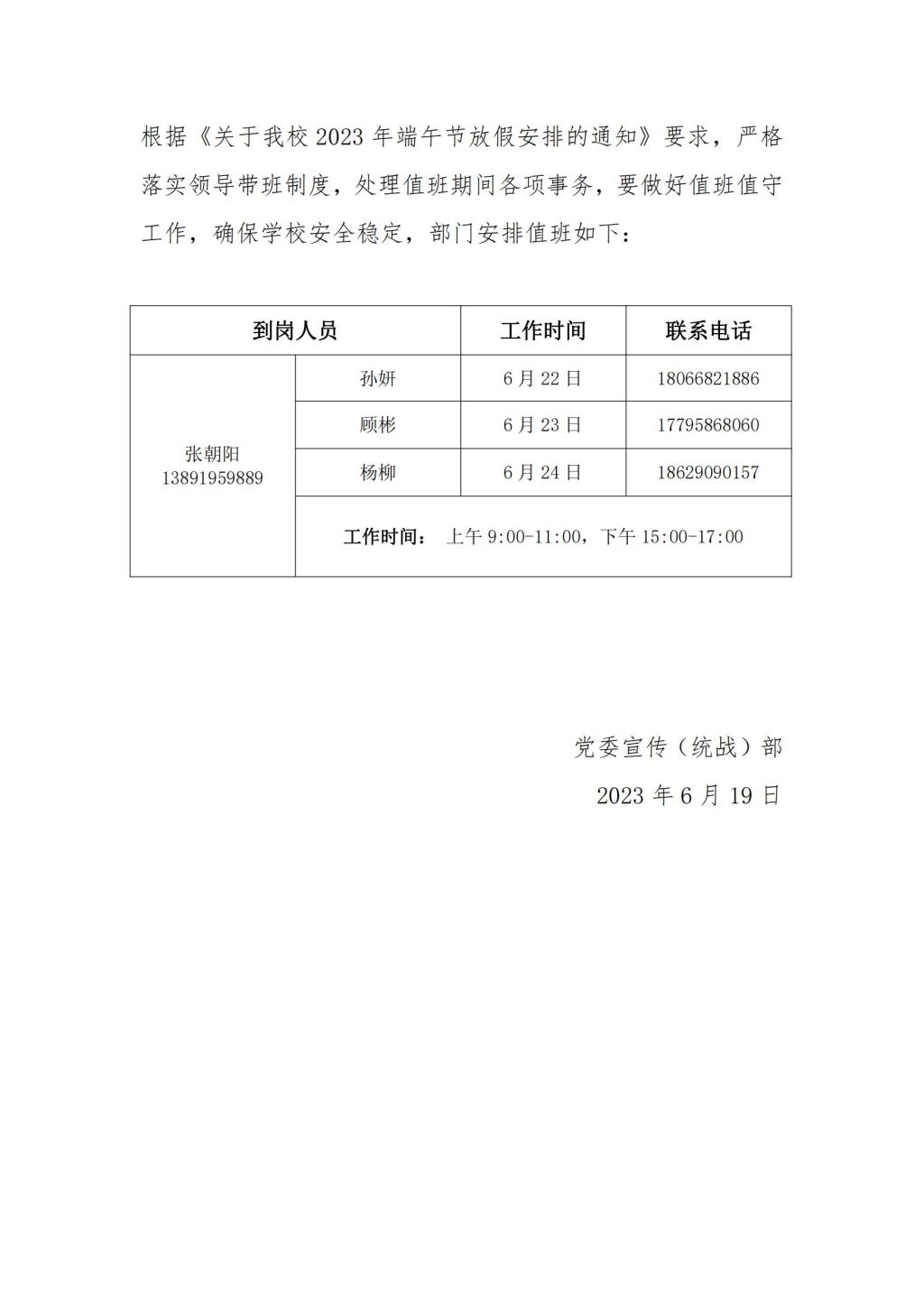 党委宣传(统战)部2023年端午节值班安排