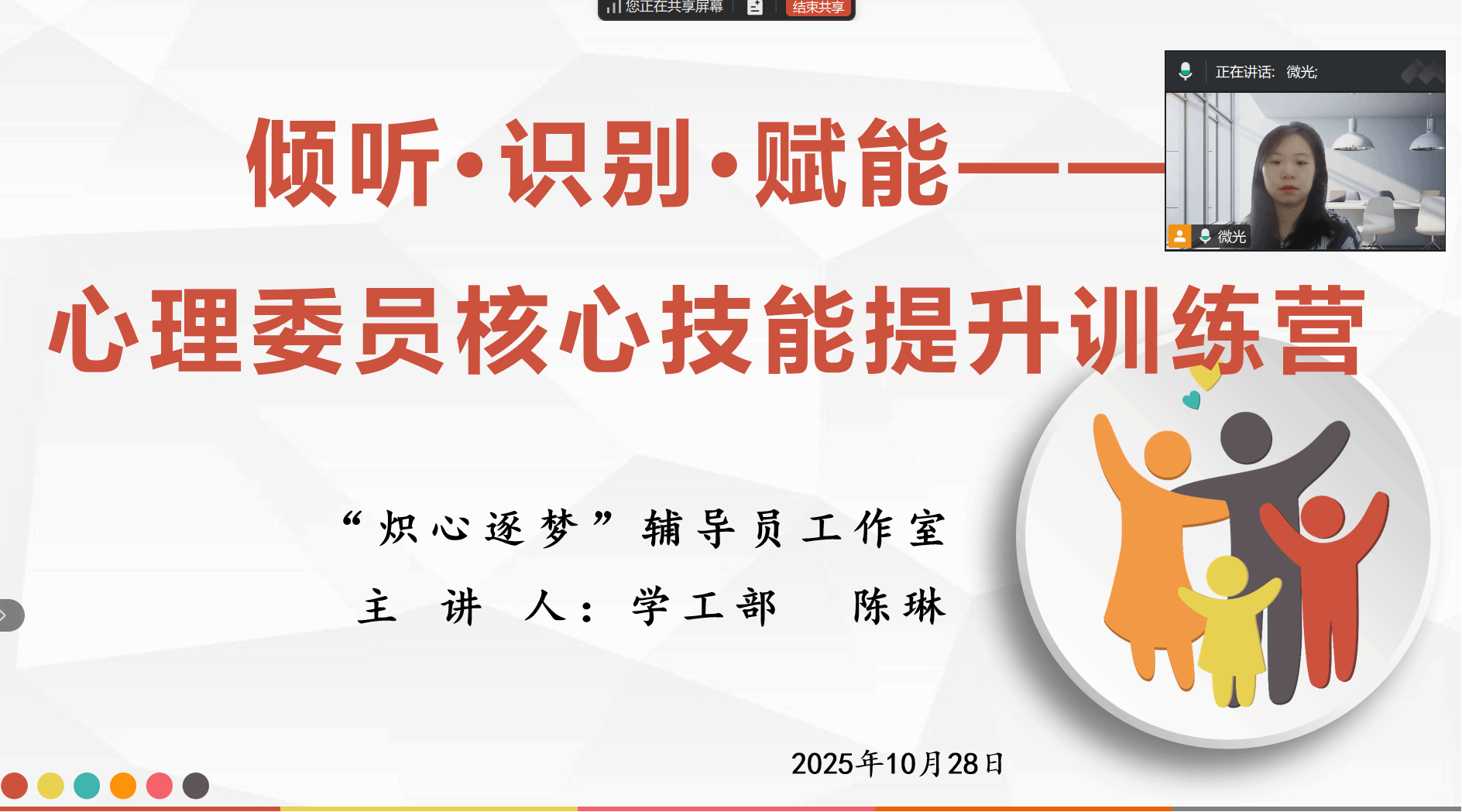 10月28日,心理健康专职教师陈琳通过腾讯会议为含光校区的心理委员们开展线上培训。培训围绕中国大学生心理健康现状、深入解析了大学生异常心理表现与信号识别、班级心理委员工作职责及朋辈互助技巧等,进一步提升心理委员的心理危机识别及朋辈心理帮扶能力。