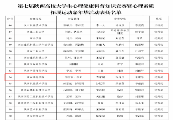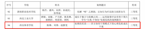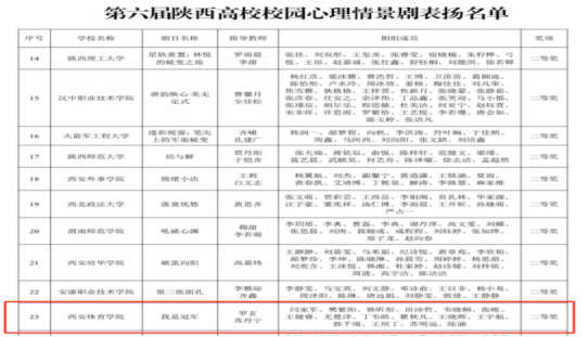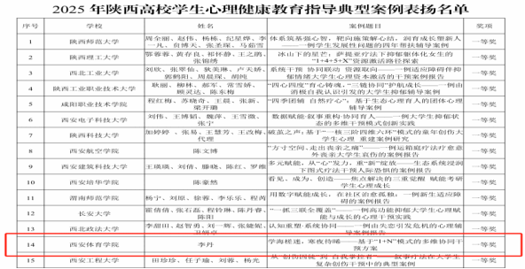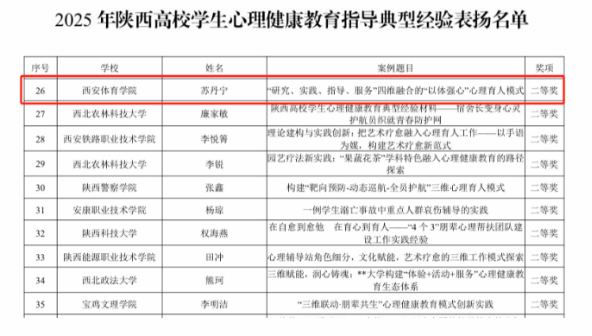 2025年,我校师生在陕西高校第十届“阳光护航”心理育人宣传季实践活动中荣获佳绩,取得新突破。心理健康教育指导典型案例《学海槎迷,寒夜待晞——基于“1+N”模式的多维协同干预方案》荣获一等奖;典型经验《“研究、实践、指导、服务”四维融合的“以体强心”心理育人模式》荣获二等奖;心理情景剧《我是冠军》荣获二等奖,典型案例《松绑的禾苗——多方协同干预模式下的心理危机成长个案》荣获三等奖。