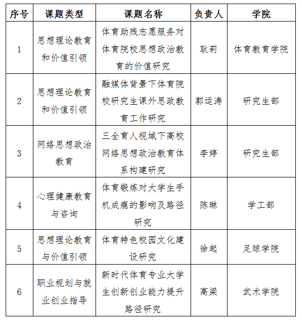 根据《中共今年会官方网站党委学生工作部关于申报2024年度学生工作专项研究课题和精品项目的通知》的要求,学工部组织专家对所申报项精品项目和专项研究课题进行了公开、公正、公平的评审,决定立项2项精品项目、6项专项研究课题,现予以公示,具体名单如下: