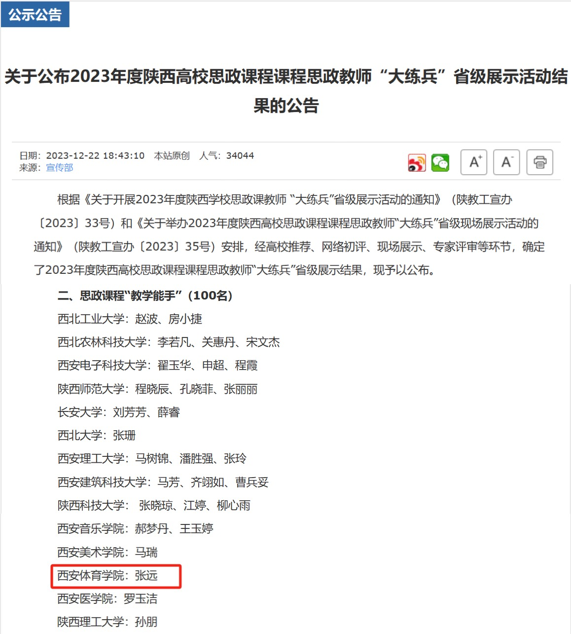 2023年12月21日,由陕西省教工委、省教育厅组织的2023年度陕西高校思政课程课程思政教师“大练兵”省级现场展示活动在西北工业大学(友谊校区)成功举办,本次省级展示活动共设置17个赛道,全省79所高校共240名选手参赛。我校辅导员张远老师经过校级思政“大练兵”活动选拔、省级网络初评、省级现场展示授课、答辩的层层选拔最终获得思政课程“教学能手”称号。