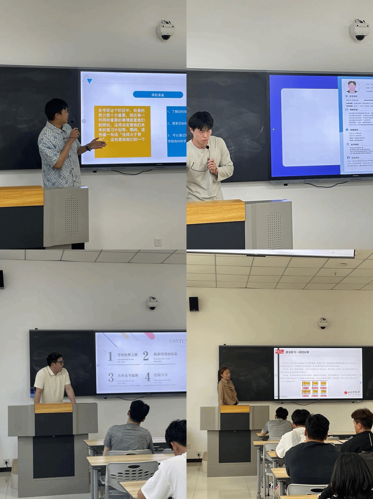 张芮铭率先登台,分享了自己在备考期间如何制定科学的学习计划,合理分配时间给不同学科,让复习有条不紊。他鼓励大家在面对难题时,不要轻易退缩,要坚信自己有攻克的能力。张佳豪着重讲述了专业课复习的要点,从搭建知识框架到深入理解核心内容,每一步都详细剖析,为同学们指明专业课学习的方向。马嵩晨则聚焦心态调整,讲述自己在备考压力下,如何通过运动、与朋友交流等方式排解焦虑,始终保持积极乐观的备考状态。芮骏贤从院校和专业选择的角度出发,分享了自己如何结合兴趣、职业规划以及院校招生情况等因素做出合适的选择,同时还介绍了信息收集的有效途径。卢耀泓将复试的准备经验毫无保留地分享出来,包括面试技巧、如何突出自身优势等内容,为同学们的复试环节提供了实用的指导。
