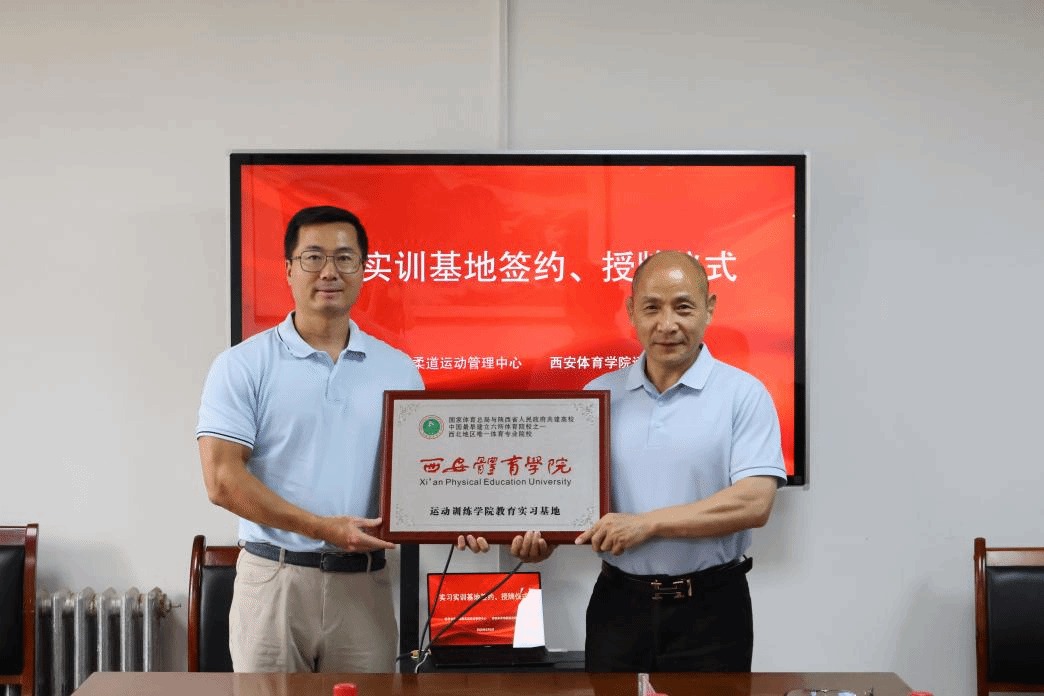 随后,双方签署合作协议,运动训练学院向省举摔柔中心授予实习基地牌,标志着长期合作机制正式建立。最后,全体参会人员合影留念,为此次深度合作留下珍贵记录。
