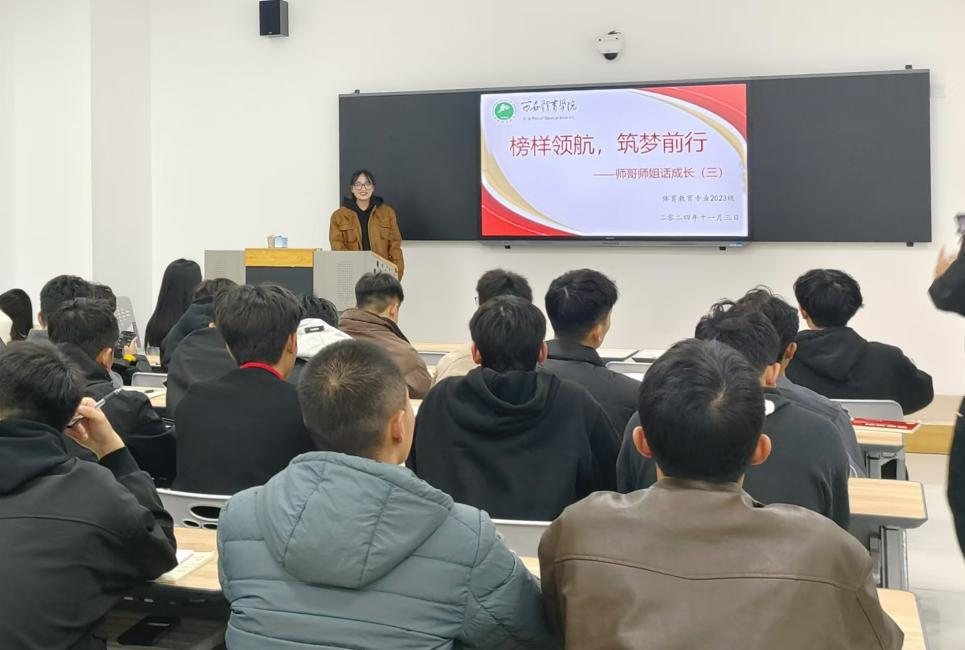 为加强体育教育学院学风建设,提高同学们的综合素质,帮助同学们更好地规划大学生活和未来职业发展,11月3日晚8:00,体育教育专业2023级组织开展“师哥师姐话成长”分享交流会。本次活动邀请到了体育教育训练学23级研究生何宇学姐进行经验交流分享。 体育教育专业23级年级主任宗月民、辅导员胡雪娇以及23级全体班委参加。
