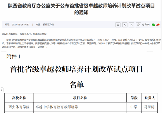 近日,陕西省教育厅公布了首批省级卓越教师培养计划改革试点项目,我院“卓越中学体育教育教师培养”项目成功入选。