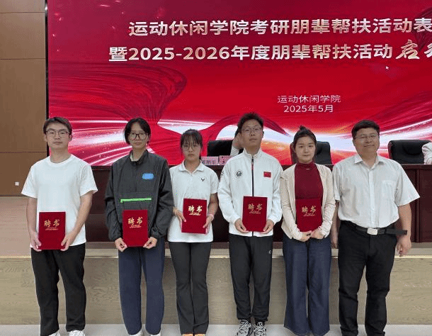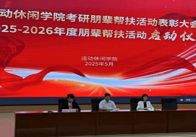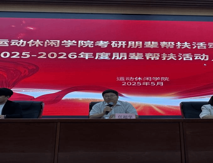 为深化学风建设,凝聚榜样力量,5月16日上午10点,今年会官方网站运动休闲学院在鄠邑校区图书馆三楼隆重举行2024—2025年度考研朋辈帮扶表彰大会暨2025—2026年度帮扶活动启动仪式。学院党政班子成员、党政办、学工办、全体专兼职辅导员,以及2025届优秀考研学子、2026届全体本科生和新一届朋辈帮扶导师共同参与,党政办主任董鹏举主持会议。